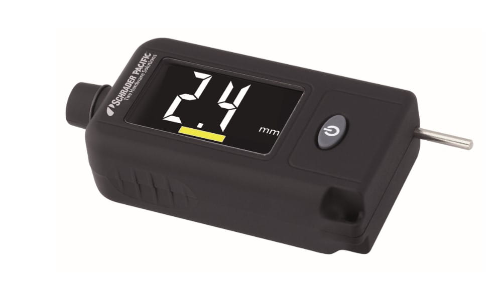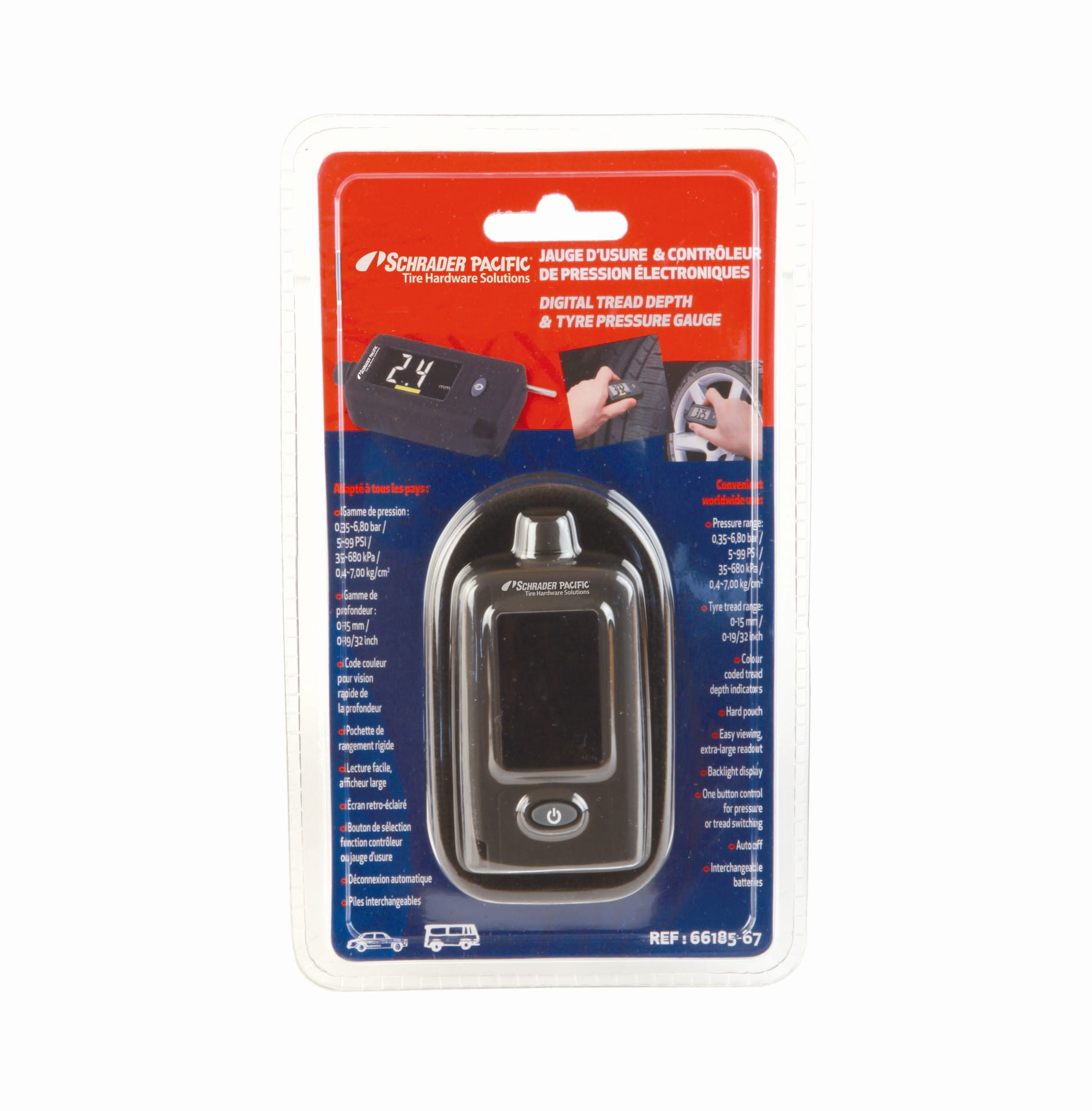Elektroniczny ciśnieniomierz z głębokościomierzem do opon marki Schrader. Pozwala zmierzyć ciśnienie opon w zakresie od 0.35 bar do 6.8 bar i wyświetlić je w sposób cyfrowy. Maksymalna głębokość bieżnika opony wynosi 15mm.