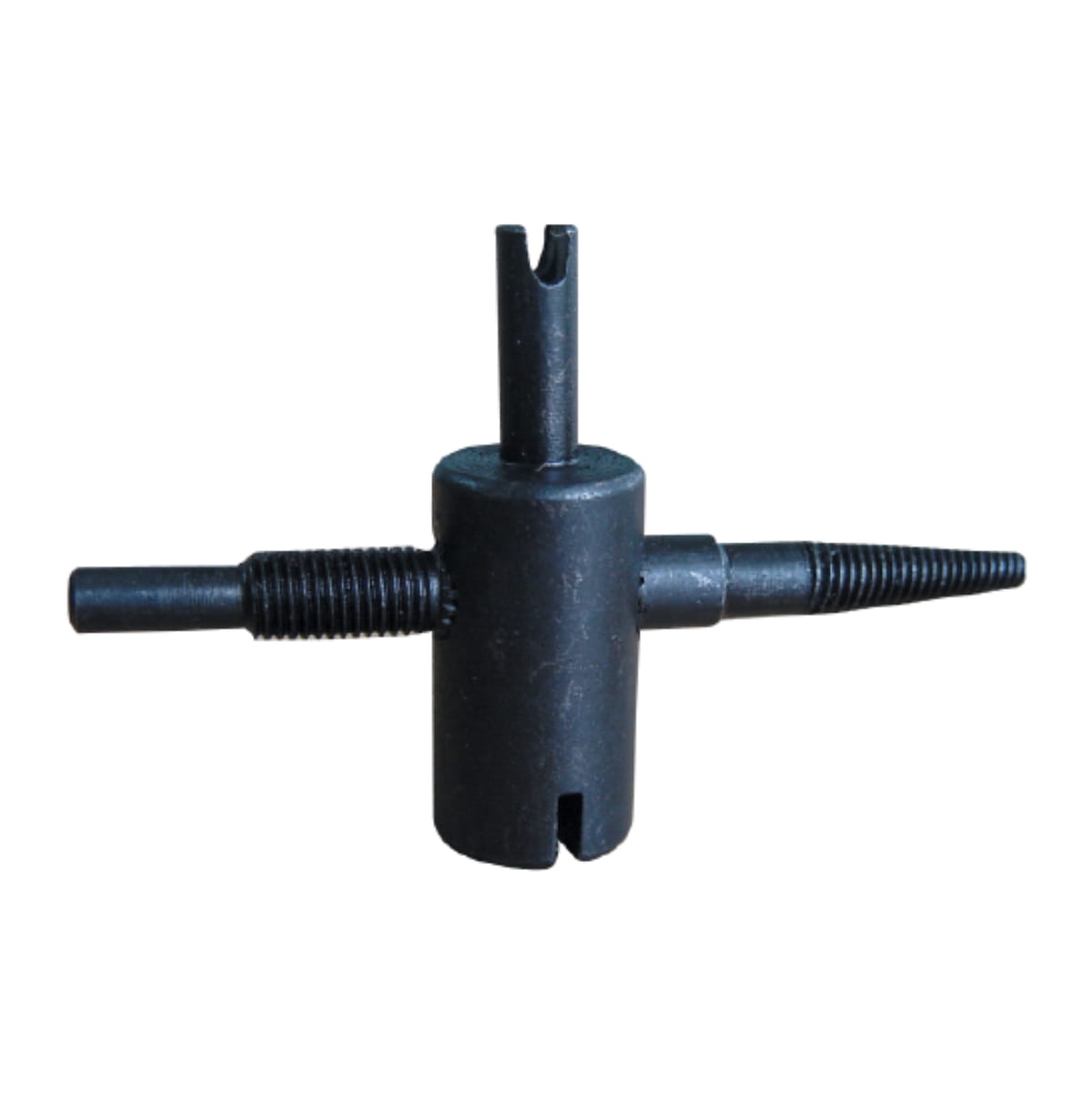 4 funkcyjny przyrząd do kalibrowania gwintów wentyli samochodowych. Umożliwia łatwe odkręcenie czapeczki zaworu, wkładki zaworu oraz naprawę gwintu zaworu koła. Produkt marki HD Vulc.
