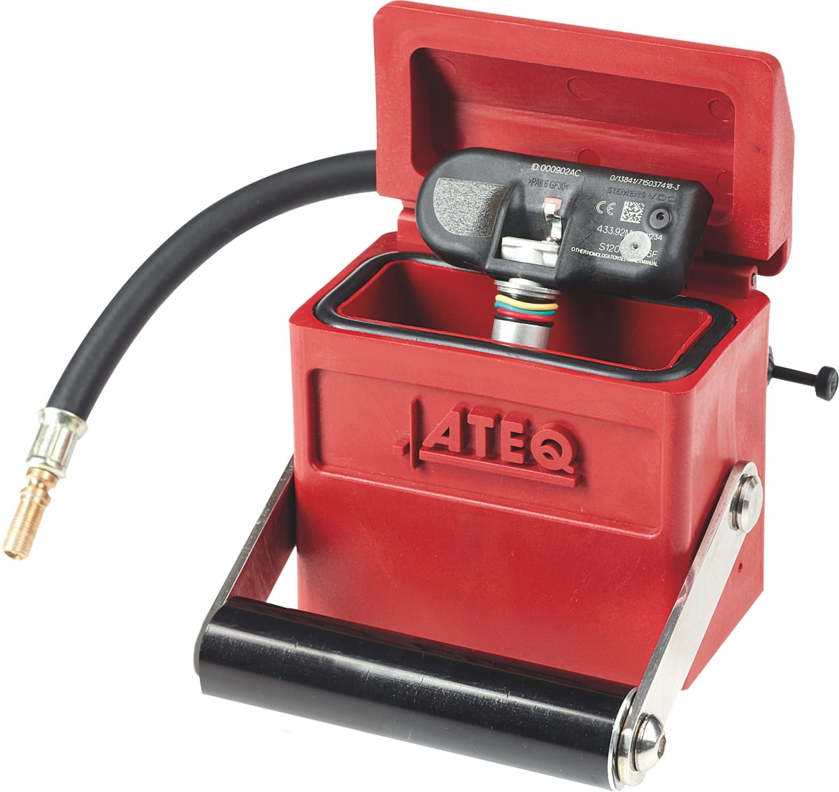 Komora ciśnieniowa AteQ umożliwiająca szybkie i dokładne sprawdzanie czujników TPMS wraz z zaworem pod ciśnieniem, bezpośrednio przed montażem czujnika na felgę.
