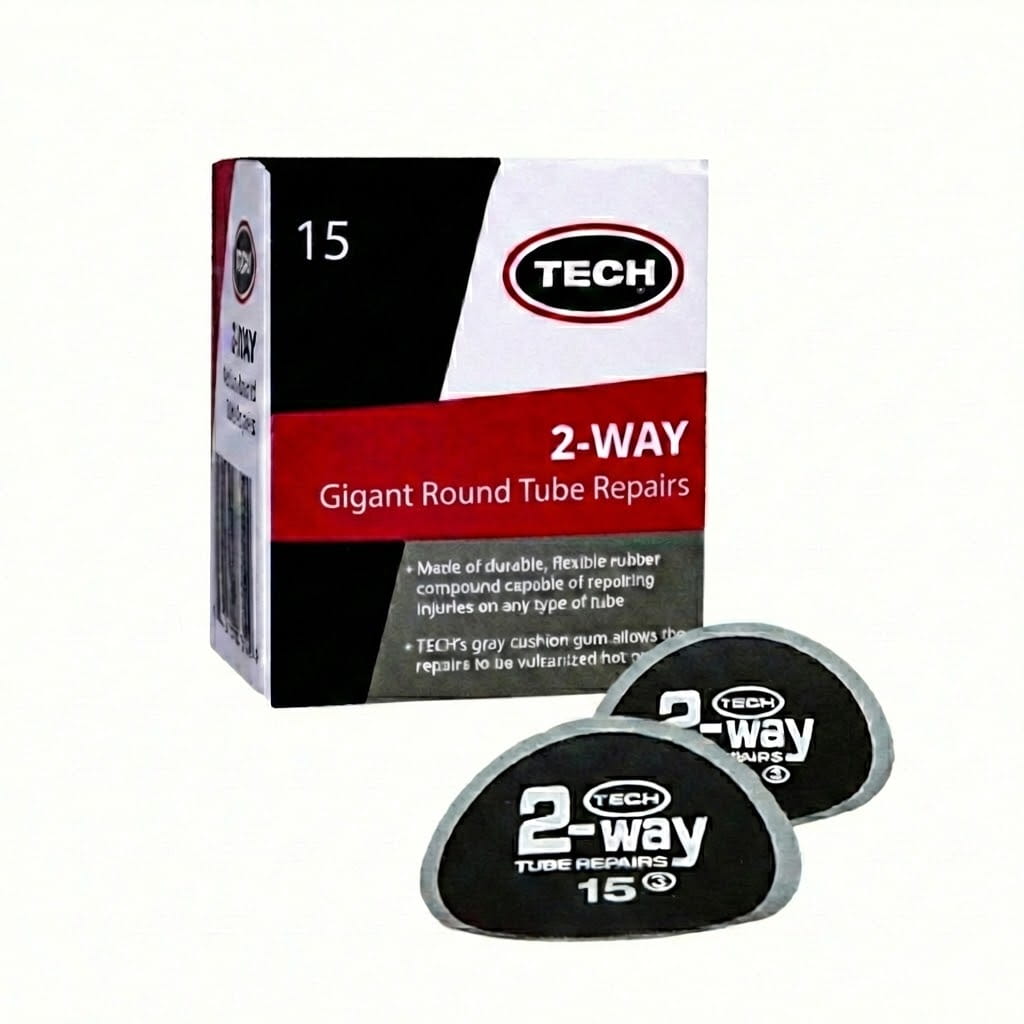 Łatki do dętek TECH 2-Way posiadają wytrzymałość dwukrotnie większą niż sama dętka. Produkowane są w kształtach owalnym i okrągłym dzięki temu można je stosować do różnego rodzaju uszkodzeń dętki. Dostępne w rozmiarach od 25 do 125 mm. Po naprawie dętki nie zapomnij o naniesieniu talku do opon.