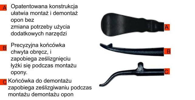 Najlepsze efekty uzyskuje się używając dwóch łyżek jednocześnie w połączeniu z płynem do montażu opon TECH Rim Ease i płynem do zbijania opon TECH Bead Breaker.