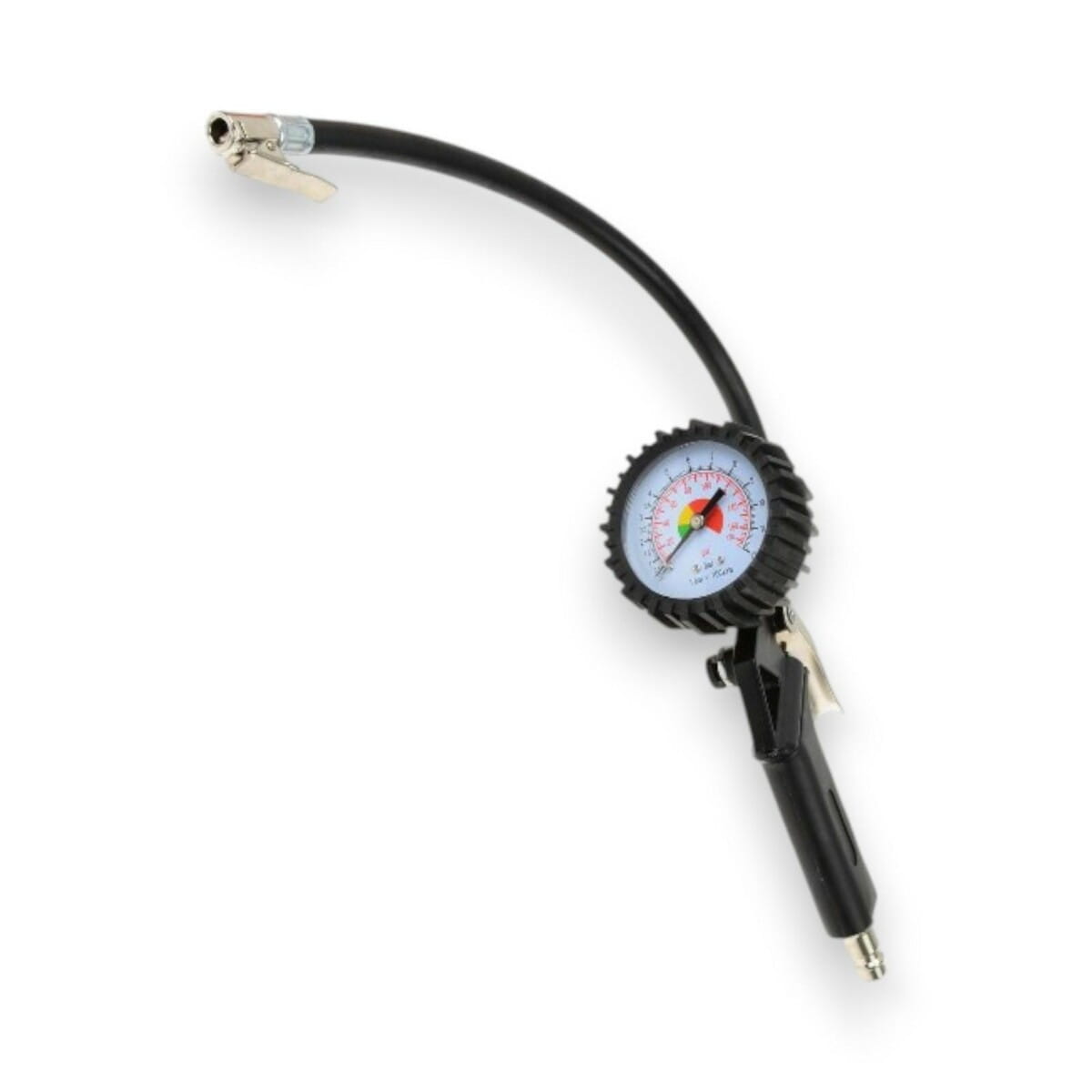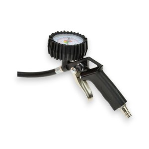 Profesjonalny pistolet z manometrem przeznaczony do pompowania kół samochodów osobowych i ciężarowych. Wyposażony w elastyczny wężyk o długości 37 cm i duży czytelny manometr w gumowej osłonie chroniącej przed wstrząsami i uderzeniami. Skala pomiarowa w dwóch jednostkach - Psi i Bar. Szybkozłącze 1/4" pozwala na szybkie podpięcie do kompresora.