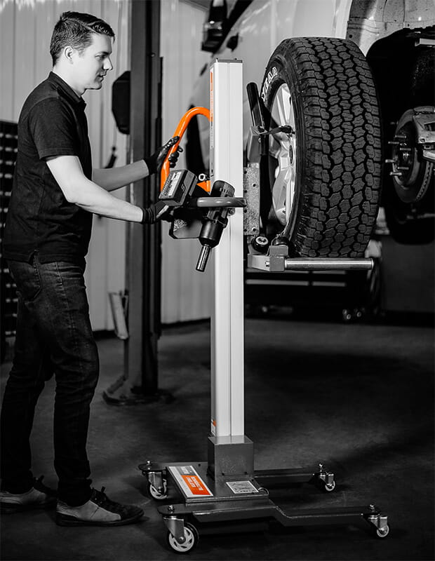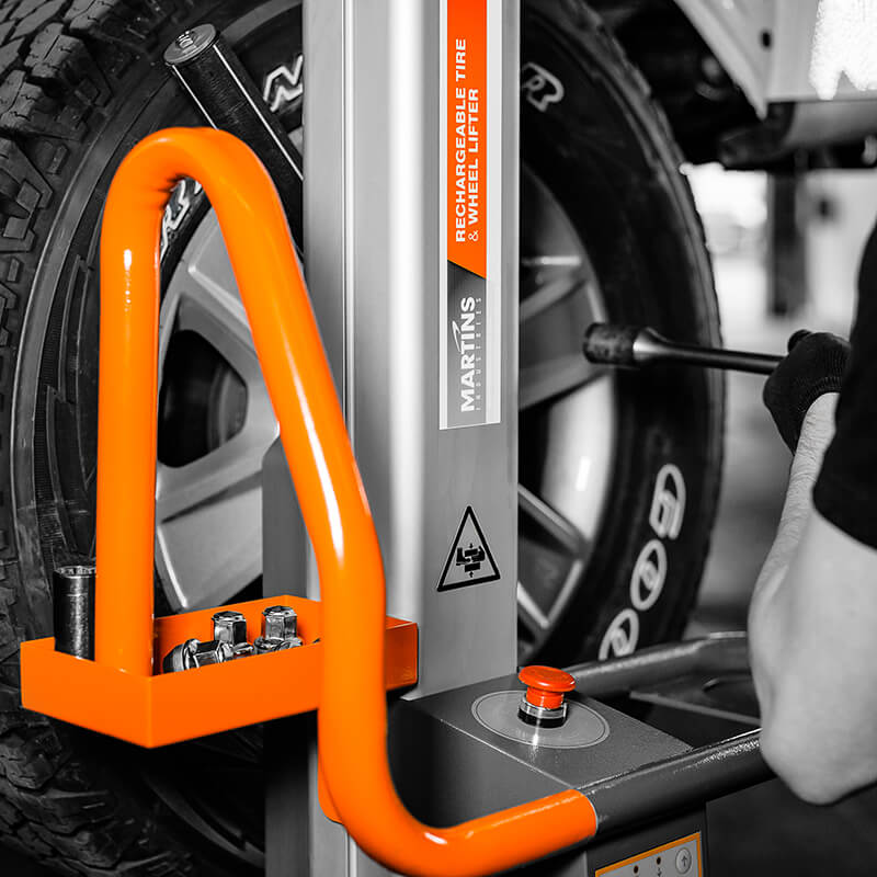 Podnośnik posiada specjalne rolki ułatwiające obrót i wycentrowanie koła na piaście pojazdu. Przesunięcie konstrukcyjne kolumny podnośnika zapewnia pełny dostęp do nakrętek kół. Blat narzędziowy i uchwyt na klucz udarowy zaprojektowano tak, by wszystkie narzędzia znajdowały się we właściwym miejscu.