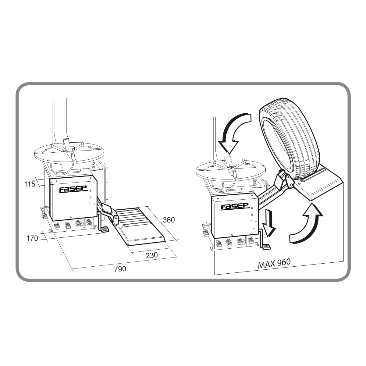 Pneumatyczny podnośnik koła włoskiej firmy FASEP. Przeznaczony jest do montażownic umożliwiających montaż na przedniej ścianie obudowy. Wyposażony jest w pneumatyczne sterowanie i płytę rolkową ułatwiającą obracanie kołem w trakcie zbijania. Mocny siłownik pneumatyczny doskonale radzi sobie z ciężkimi kołami.
