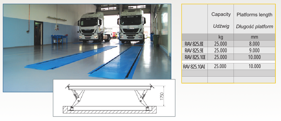 Profesjonalny podnośnik nożycowy przeznaczony do podnoszenia pojazdów ciężarowych z możliwością pracy w parze z elektroniczną synchronizacją. Dostępne długości platformy: 6 m; 8 m; 9 m; 10 m; 11 m; 12 m; 13 m; 14,5 m. Udźwig 25 T. Zobacz wybrane realizacje na naszej stronie.