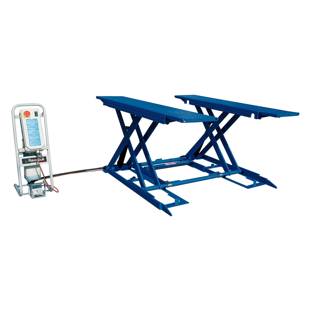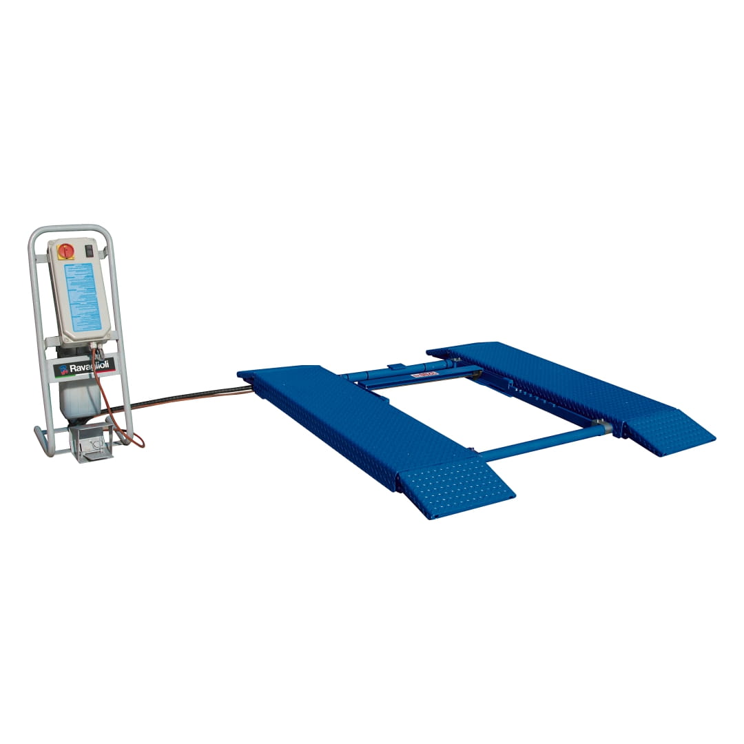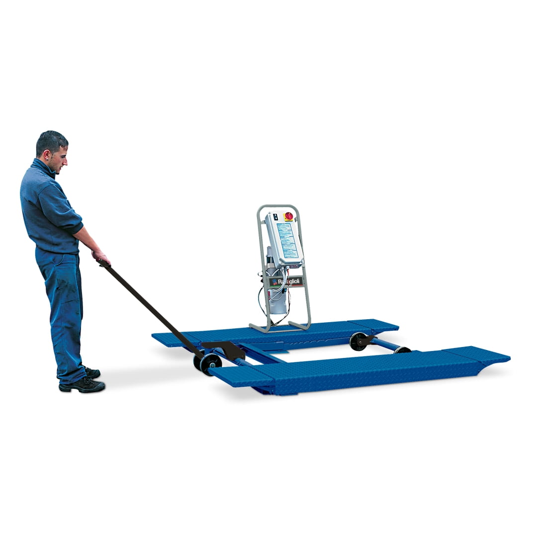 Podnośnik RAVAGLIOLI RAV1450P w wersji na posadzkę, przeznaczony do wymiany opon i szybkiej obsługi klocków hamulcowych oraz innych elementów. W standardzie wyposażony jest w zestaw transportowy S1450NA1 umożliwiający łatwe przestawianie podnośnika w hali warsztatowej.