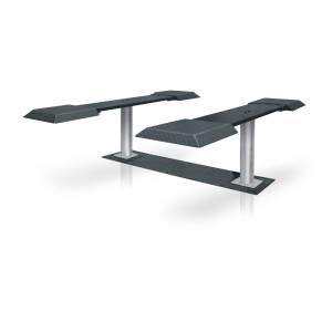 Podnośnik stemplowy platformowy. Posiada możliwość łatwego zablokowania najazdów w pozycji poziomej.