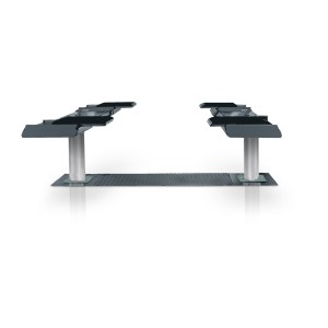 Podnośnik stemplowy platformowy. Posiada możliwość łatwego zablokowania najazdów w pozycji poziomej.
