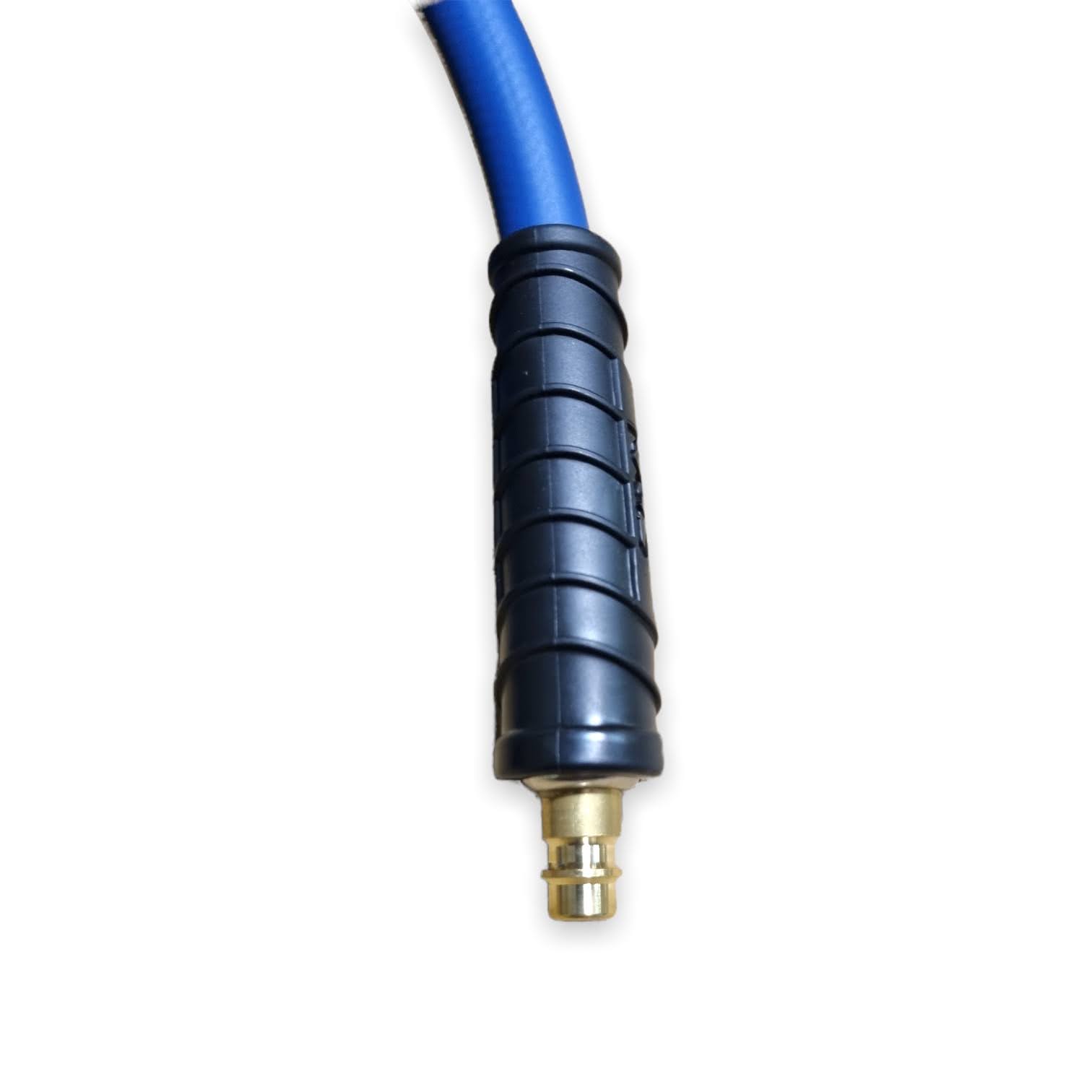 Przewód pneumatyczny zakuty jest w wysokiej jakości szybkozłącza przemysłowe 26KA+26SF. Złącza o zastosowaniu uniwersalnym, wykonane z mosiądzu. Poprzez zastosowanie hartowanych kołków ryglujących możliwa jest współpraca z narzędziami wyposażonymi we wtyczki stalowe.