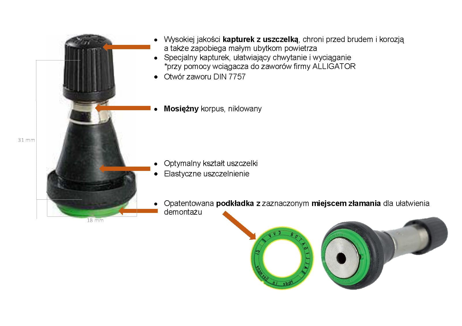 Wentyle do felg gumowo-mosiężne, bezdętkowe - Alligator TR412HP CVV easy - 18 x 31 mm. Łączą zalety zaworów gumowych i metalowych! Występuje również w innych rozmiarach.