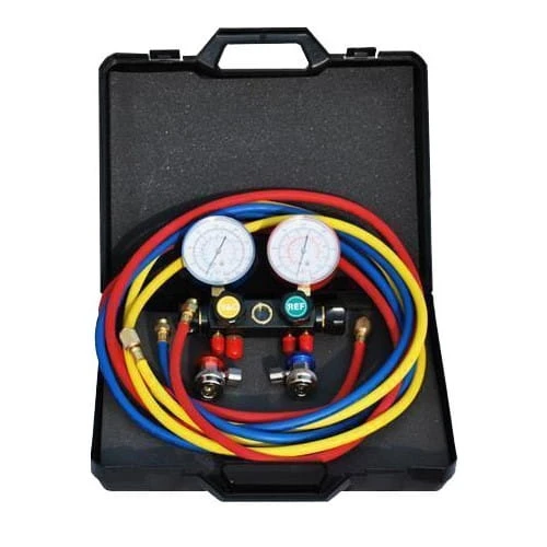Zestaw manometrów do azotu i przewody z szybkozłączami w walizce. Zestaw przeznaczony jest do kontroli szczelności układu klimatyzacji R1234yf metodą azotową.
