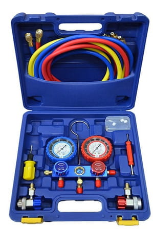 Zestaw manometrów do azotu i przewody z szybkozłączami w walizce. Zestaw przeznaczony jest do kontroli szczelności układu klimatyzacji R134a metodą azotową.