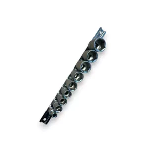 Zestaw nasadek 3/8" na listwie, zawiera 9 nasadek o różnych rozmiarach, zamocowanych na specjalnej metalowej listwie lub szynie, co ułatwia ich przechowywanie i transport.