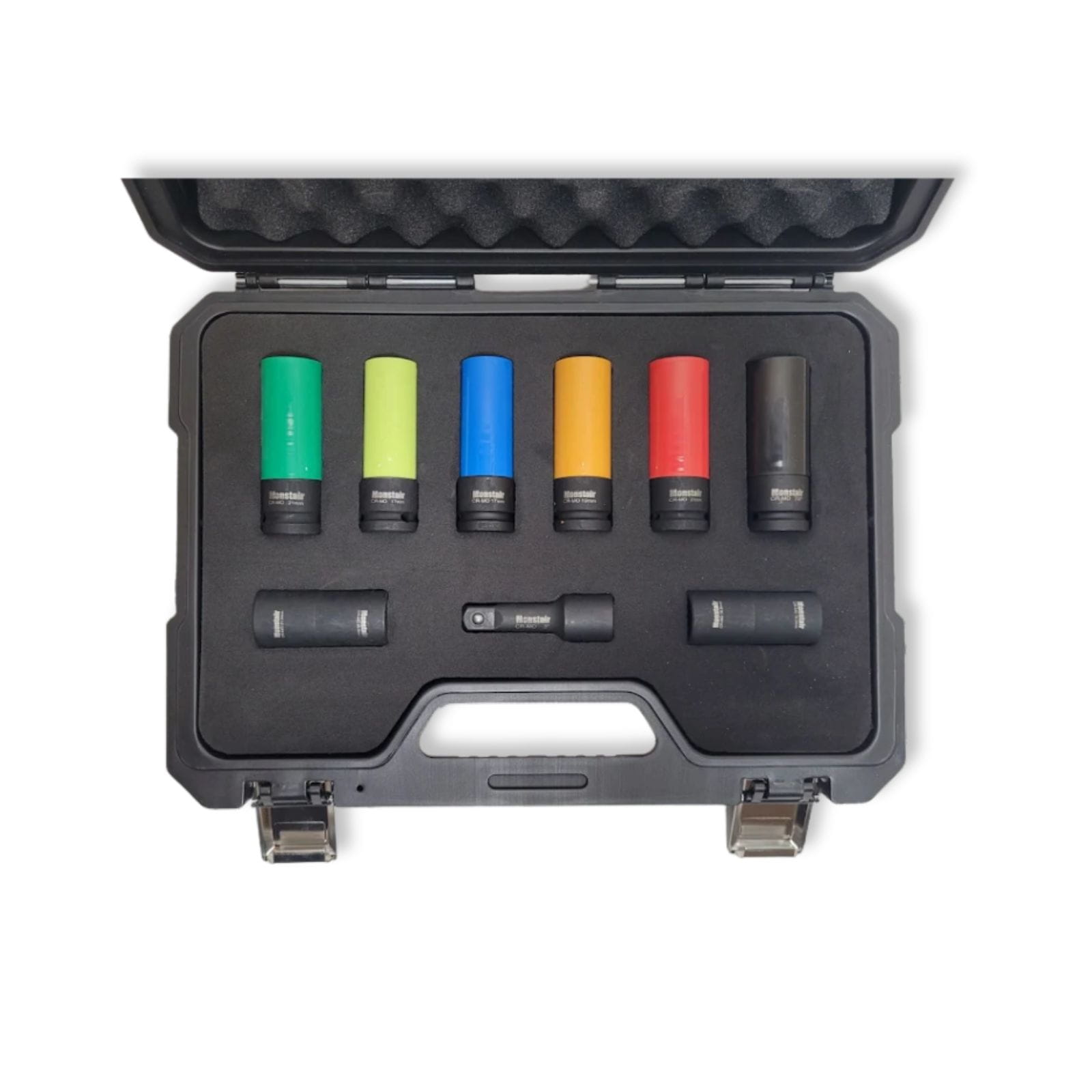Ten 9-częściowy zestaw nasadek udarowych 1/2" do śrub kół to niezbędne wyposażenie każdego warsztatu samochodowego i garażu. Zawiera szeroki wybór nasadek standardowych i specjalistycznych, zaprojektowanych do obsługi śrub kół w większości popularnych marek i modeli pojazdów.